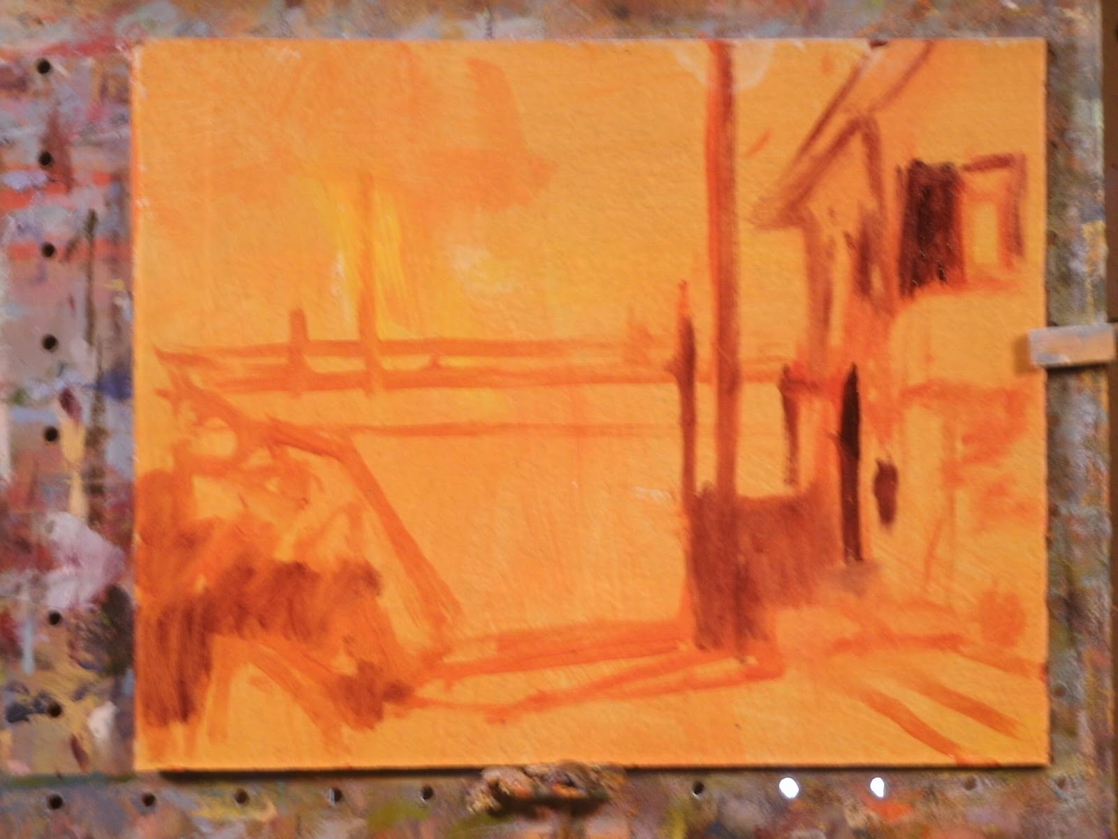 below is a glimpse into how i'm thinking in the initial 10 minutes of the block-in. i'm very concerned where the darkest areas of the painting will be and i get em in dark quick (in this case differing shades of alizarin crimson)